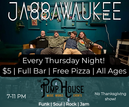 Over the last 7 years, Jabbawaukee has staked their claim as one of the top jam / funk bands in New England. Heiring from RI and MA, the quartet consists of bassist/ vocalist Brendon "Low B" Bjorness-Murano, guitarist & vocalist Dave Hobson, keyboardist & vocalist Jack Skiffington and drummer & vocalist Stu Taylor. The band released their self-produced debut full length LP "Family Tree" in late 2021, followed by the release of the video for their first single, "Ting Pop (Time Flys By)" as well as their second single "Day Roll By", featuring Dan Moretti on saxophone (Chic, Robert Plant, Aretha Franklin, Dr. John, Chaka Khan) off of the same album. That was later followed by a single release of a cover of Grateful Dead's song "New Speedway Boogie", funked up as only Jabbawaukee could do. In 2024 they released the live album "Live Worms: Live at Wormtown 2023" and are presently working on their newest album "Late Night Early Morning". All of their music can be found on all major streaming platforms.